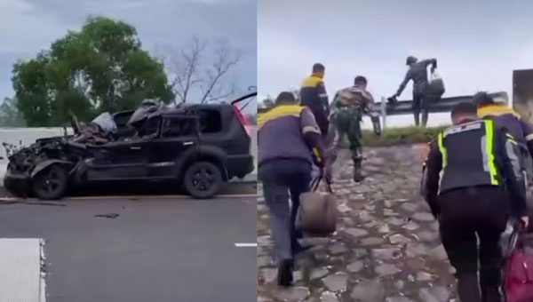 Penampakan mobil Nissan X-Trail yang kecelakaan di Tol Bakter Lampung (Kiri). Petugas menemukan tas diduga berisi narkotika (kanan). (Foto: Screenshot video viral)