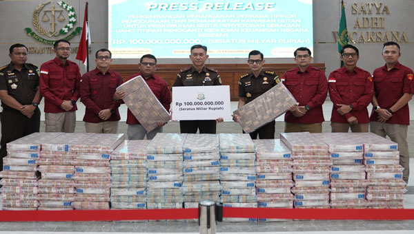 Kejati Lampung menunjukkan uang titipan Rp 100 miliar yang diterima dari kasus dugaan korupsi kawasan hutan saat konferensi pers, Rabu (25/2/2026). (Foto: Istimewa)
