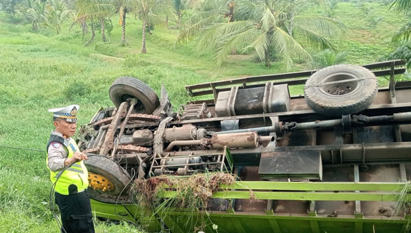 Kecelakaan tunggal tersebut melibatkan truk Hino warna hijau Nopol BG-8393-UJ. Truk dikemudikan oleh Asrul Effendi Harahap (47), beralamat di Kelurahan Rawa Maju, Kecamatan Talang kelapa, Kabupaten Banyuasin, Sumatera Selatan.