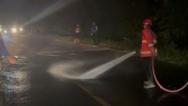 “Berdasarkan laporan tersebut kami langsung turun ke lokasi untuk melakukan penanganan dari tumpahan solar. Kami membersihkan jalan dengan cara melakukan penyemporotan, namun sebelumnya kami taburkan deterjen dulu ke jalan yang terkena tumpahan solar tersebut,” lanjut Rully.