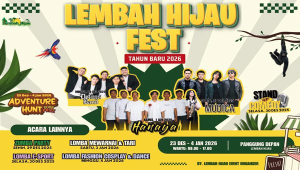 Beragam acara bertajuk ‘Lembah Hijau Fest Tahun Baru 2026’ bakal digelar di tempat wisata ini mulai dari hiburan musik, bazar kuliner, lomba e-sport, zumba party, stand up comedy, hingga adventure hunt.